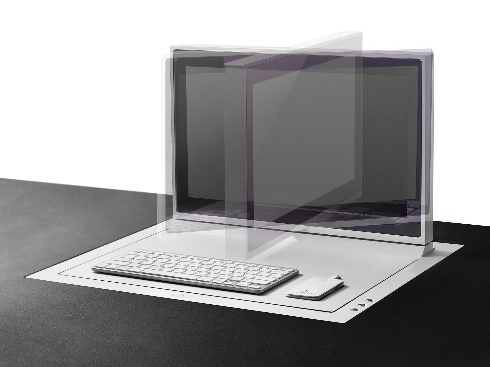 Màn hình có thể nâng lên và nghiêng, với chuyển động xoay 180° bổ sung (và tùy chọn) và thu lại vào bên trong bề mặt làm việc ở hai vị trí khác nhau: màn hình hướng lên trên hoặc hướng xuống dưới.