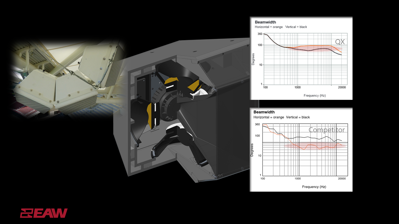 Ưu điểm công nghệ độc đáo của EAW QX5 Series nằm ở sự kết hợp giữa kiến trúc củ loa đối xứng và công nghệ xử lý DSP độc quyền. Loa sử dụng bốn củ loa tần số thấp 12 inch Phase Aligned™ được bố trí đối xứng theo cả chiều dọc và chiều ngang, giúp mở rộng khả năng kiểm soát phủ âm xuống sâu vào dải tần số thấp (tới 250Hz).