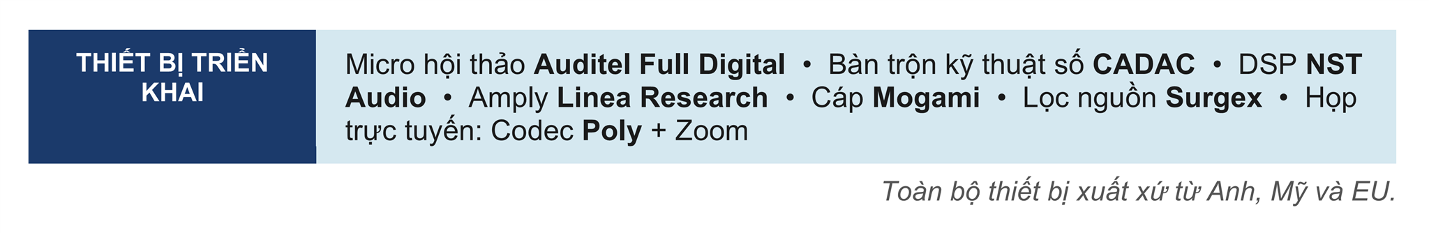 Nguồn thiết bị duy nhất có thể huy động ngay lập tức: hệ thống 500 bộ micro hội thảo Auditel Full Digital vừa được Bá Hùng lắp đặt ngày 29/09/2020 cho hội trường 800 chỗ của chính cơ quan này, cùng toàn bộ hệ thống bàn trộn kỹ thuật số CADAC (Made In England), DSP NST Audio (Made In England), Amply Linea Research (Made In England), và hạ tầng Pro AV đi kèm. Giải pháp: tách 100 bộ micro từ hệ thống đó, mang sang phòng họp lân cận, setup lại hoàn chỉnh.