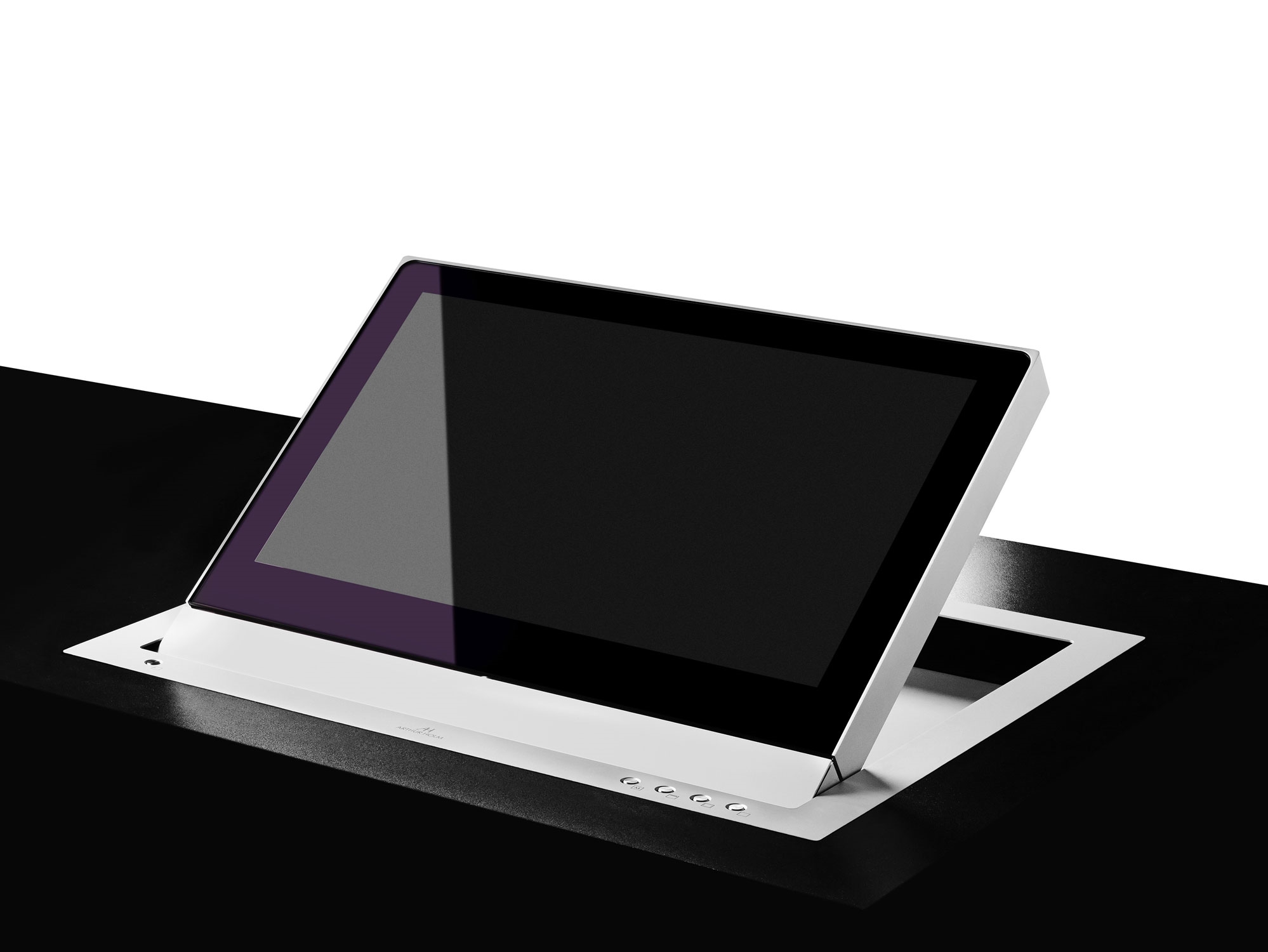 Màn hình được bảo vệ tối đa khỏi mọi hư hỏng bề mặt, kéo dài tuổi thọ thiết bị. Không gian làm việc đa năng được giải phóng hoàn toàn khi không sử dụng, duy trì sự thanh lịch và gọn gàng tuyệt đối. Khả năng điều chỉnh góc nhìn (từ phẳng trên bàn cho đến 90 độ thẳng đứng) cho phép mọi người tham gia tương tác, xem nội dung và giao tiếp mắt tự nhiên mà không bị cản trở, từ đó tăng cường sự hợp tác và hiệu quả trong mọi cuộc họp.