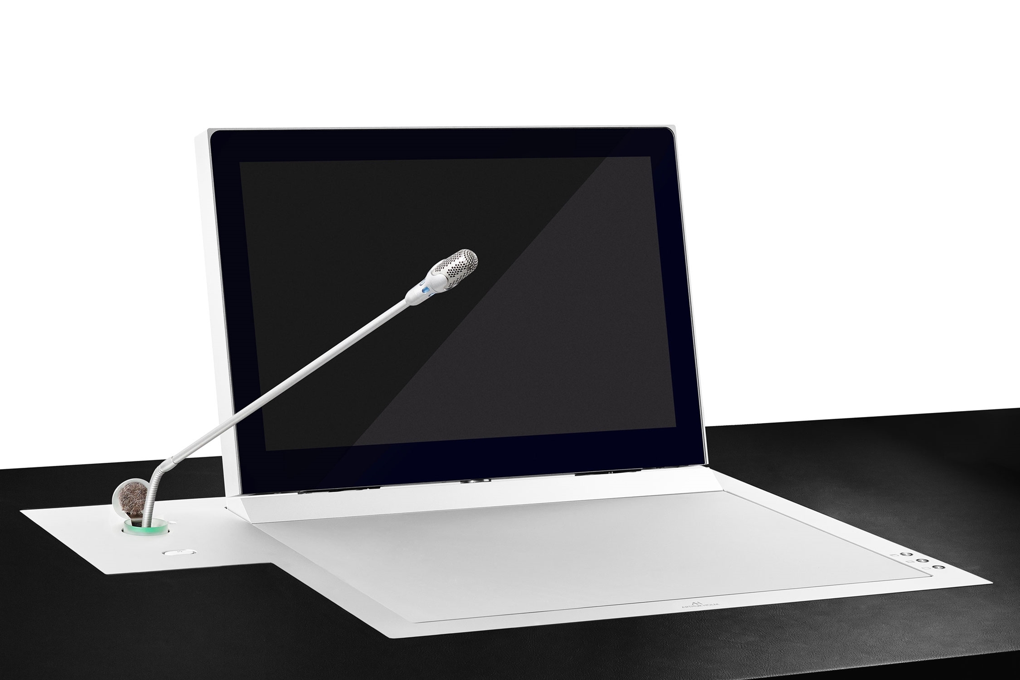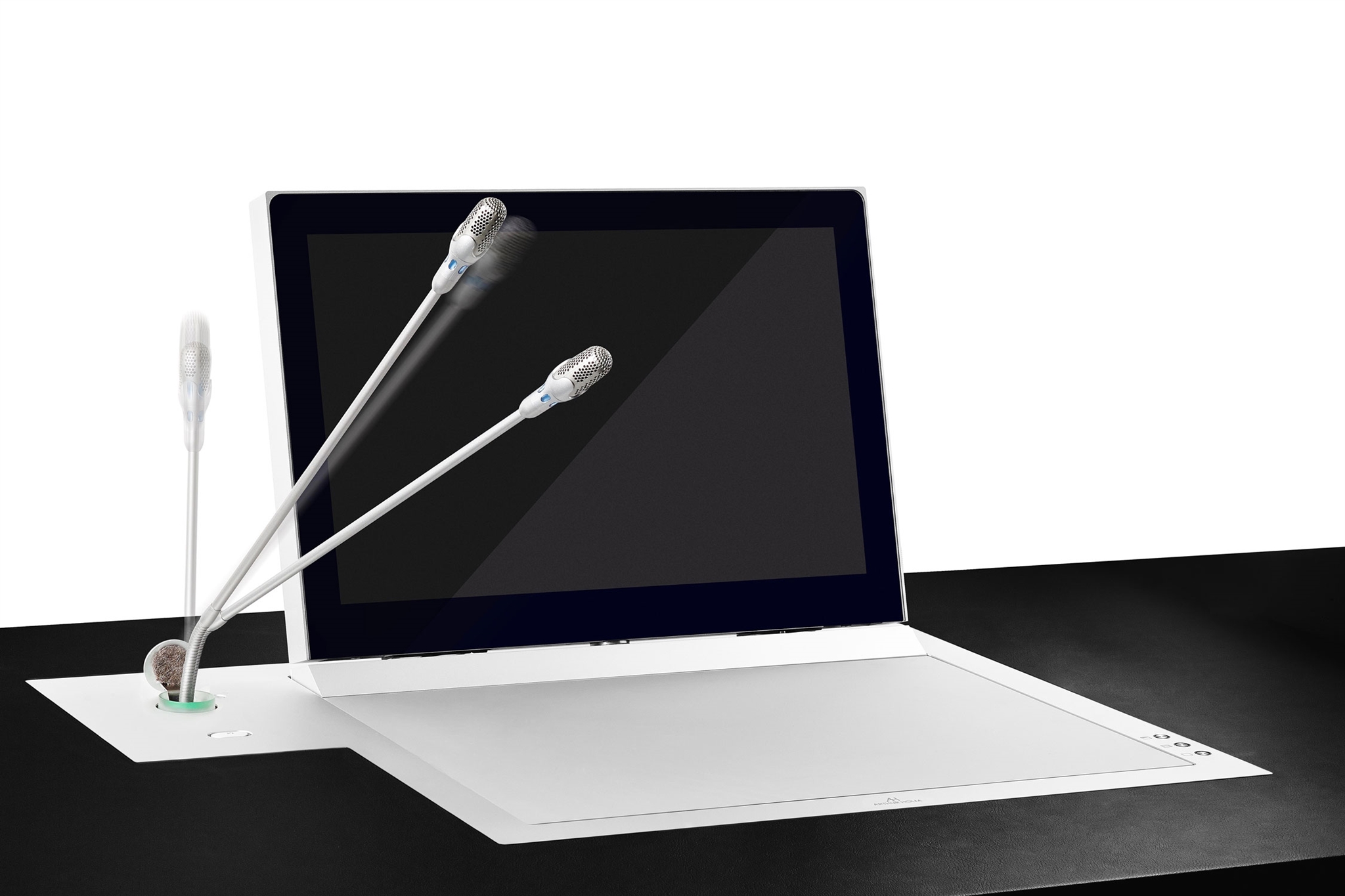 Khách hàng đã tích hợp Dynamic3Talk, hệ thống màn hình cơ giới có thêm cơ chế nâng micro cổ ngỗng độc lập. Khi cần thuyết trình hoặc phát biểu, chỉ cần một nút nhấn, màn hình và micro (tùy chọn) sẽ tự động đồng bộ nâng lên. Dynamic3Talk còn có vòng đèn LED 360 độ quanh micro để báo trạng thái (bật/tắt) rõ ràng. Khi không sử dụng, cả màn hình và micro đều rút gọn hoàn toàn xuống dưới mặt bàn, trả lại không gian phẳng, không tì vết.